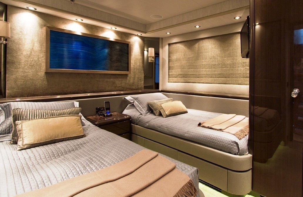 The cabin has six large portholes to port and starboard giving plenty of natural light. There are electrically operated blackout shades which will completely darken the stateroom, great for when in port or for an afternoon nap. There is a Settee on the starboard side and a Vanity to port.