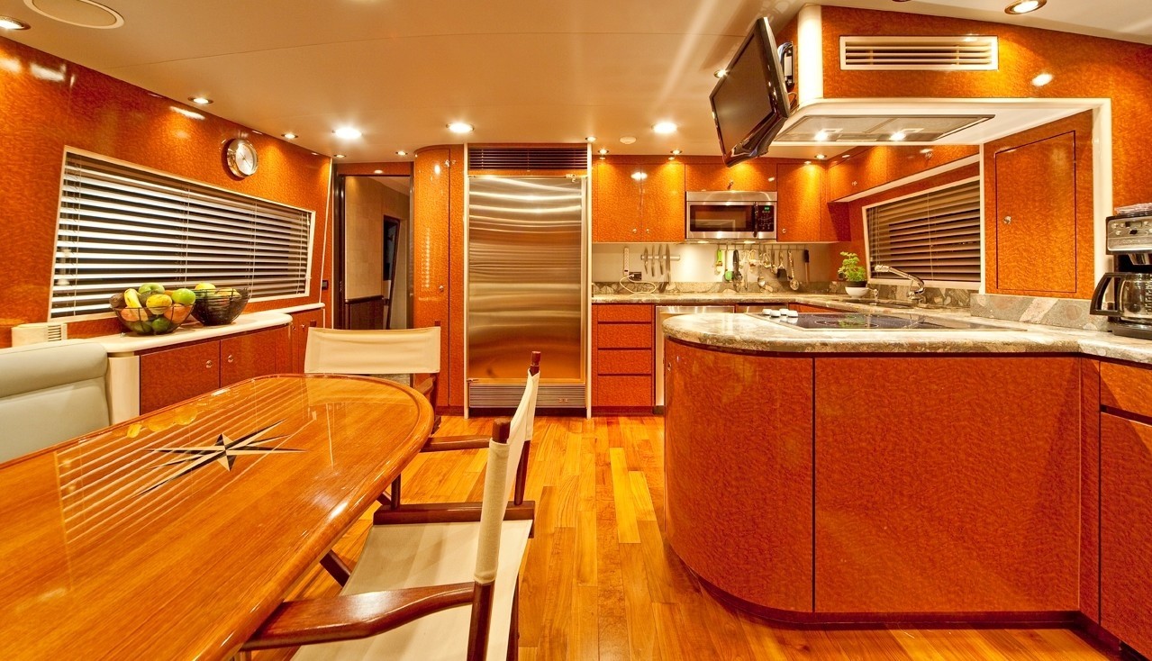Forward to starboard down a short corridor is the galley. Also in the passage way is the 5-step stairway to the raised pilot house and the semi-circular stairwell down to the accommodation deck.