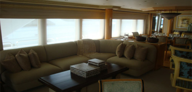 She has a large main salon with an L-shaped sofa with 3 ottomans and a full wet bar with bar stool seating for 4 guests.