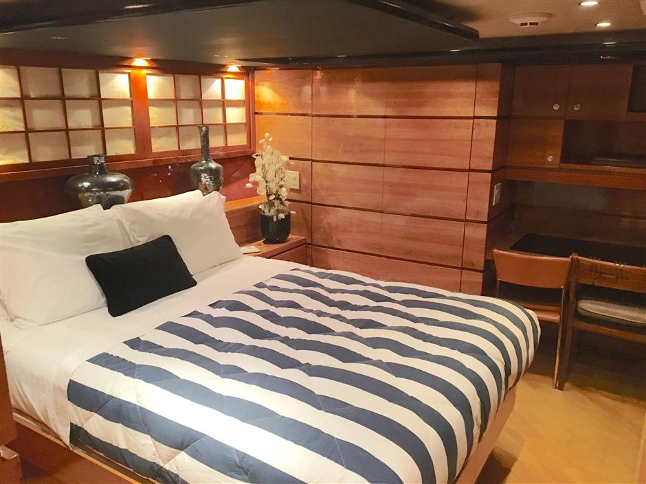 She has a large main salon with an L-shaped sofa with 3 ottomans and a full wet bar with bar stool seating for 4 guests.
