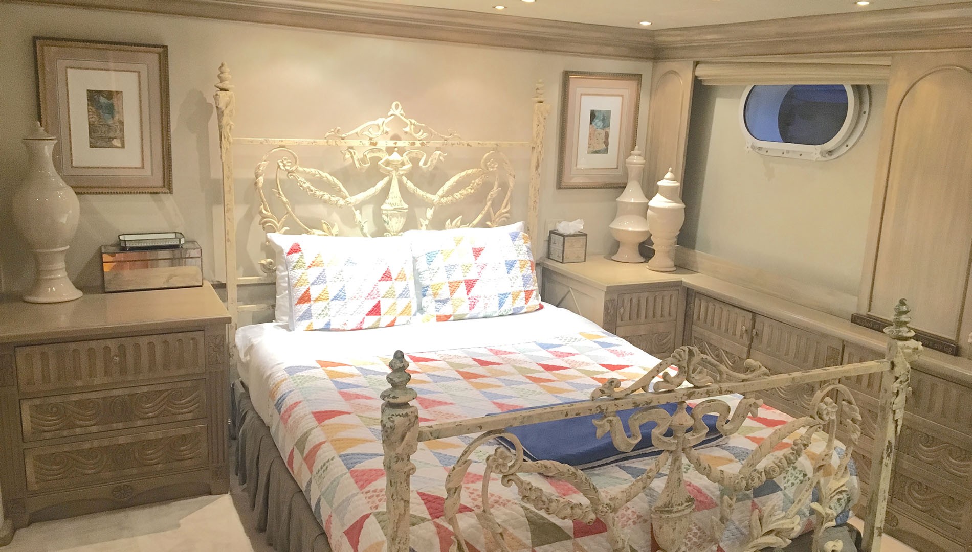 Further forward of the salon is the formal dining area able to seat 8. The Sky lounge with a full wet bar with stool seating for 3, a comfortable couch, game table and seating for 4. There is an entertainment centre with 27” TV/DSS/DVD/CD/Stereo Cassette with Bose Home Theatre Speaker System.