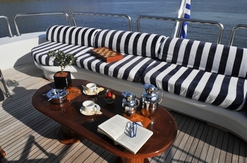 Forward the living area there is the wheel-house with a comfortable sofa for the guests to enjoy while underway.