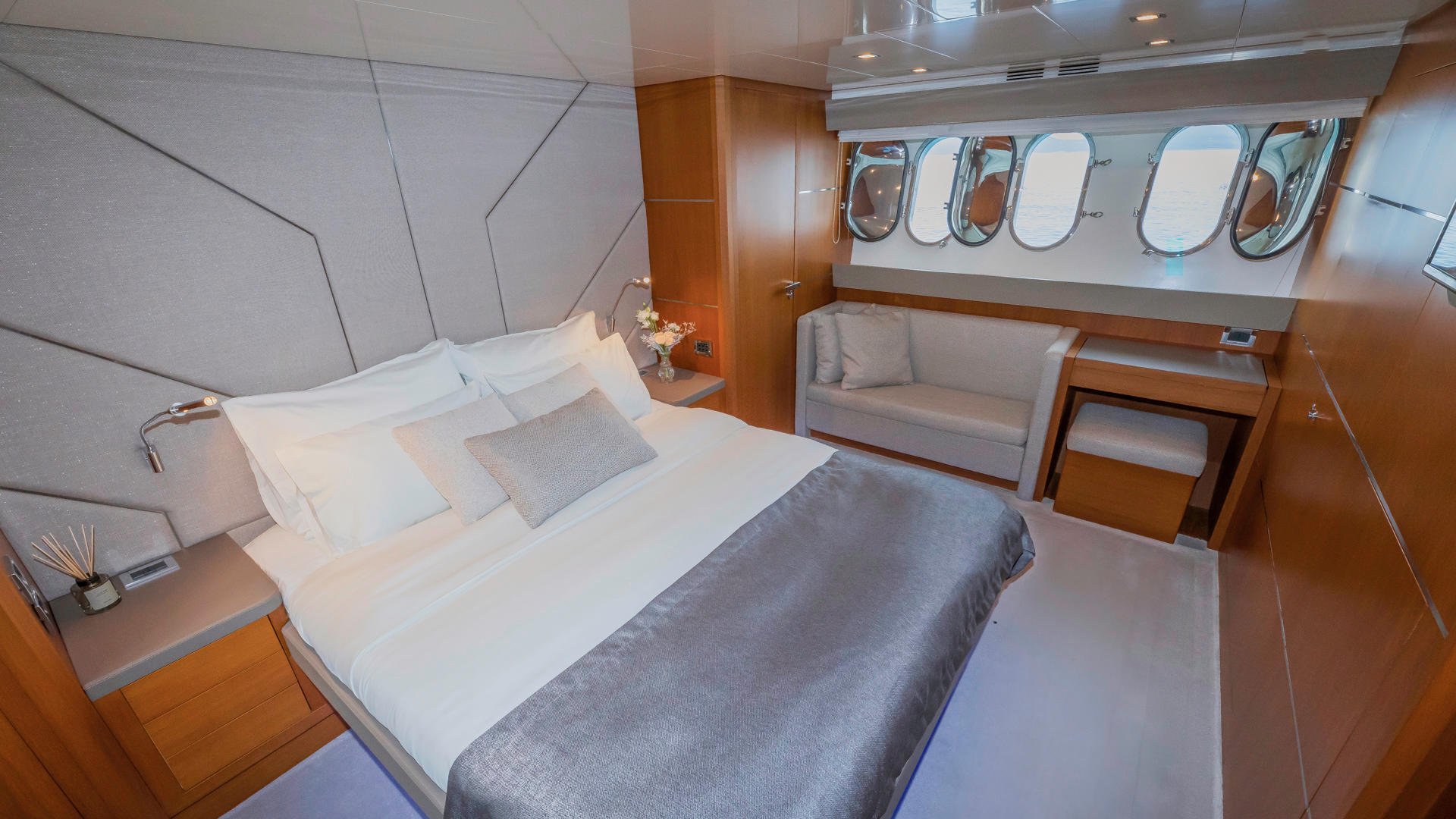The full beam owner’s suite extends across the full beam in the centre of the boat, which receives light from the large vertical portholes, three in each bulkhead. The suite has a walk-in wardrobe and bathroom with a rectangular shower, stereo CD system, 17” television, DVD and air conditioning.
