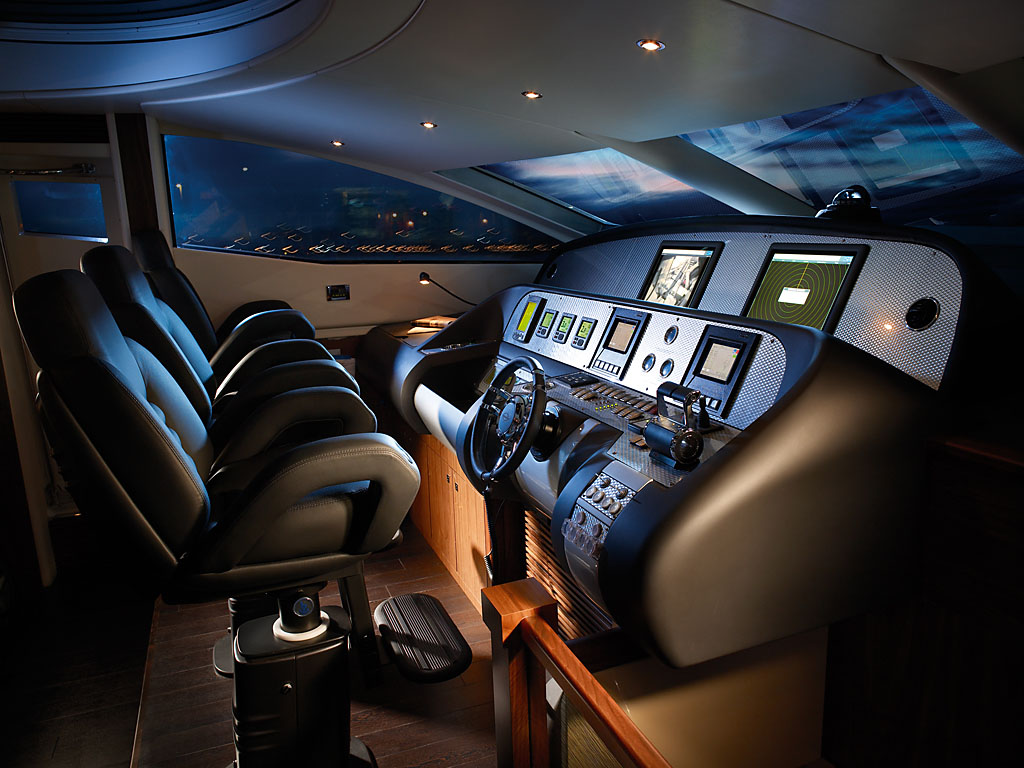 Principal features of the Sunseeker Predator 92 Sport Motor Yacht include a foredeck with seating and sunbathing area, mini flybridge area with helm position, garage for optional tender and jet-bike, fixed bathing platform, hot and cold swim shower and a wet-bar with ice maker, cool chest, sink and ceramic griddle amongst other features.