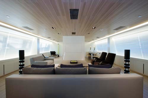 The partial central wall in the salon was chosen not only for the subtle beauty of its colour and texture but also for the way it serves to dematerialize the central stair volume. The master suite and 4 guests cabins are all located on the lower deck lower deck.