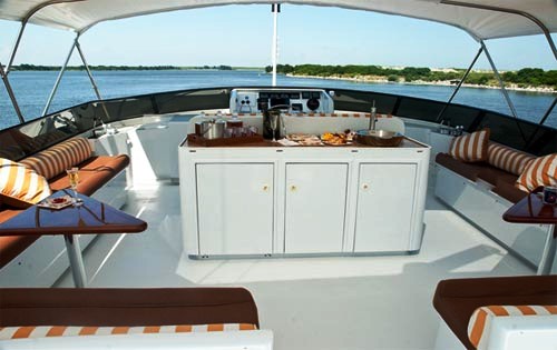 Motor yacht ESSENCE has a Fly bridge featuring a Helm station, 3 seat sofa, island bench bar, large open space lounge seating and tables, Weber BBQ, refrigerator, icemaker, 2 reclining sun lounges, an outdoor 33” flat screen TV. There is an additional area on the Bow with a large bow cushion/sun bed for sun bathing forward.