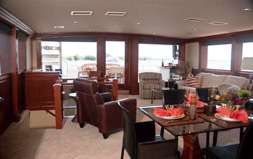Motor yacht ESSENCE has a Main Salon with light and airy décor with rich American Cherry Wood. The Salon features a large sofa with coffee table and 3 occasional chairs plus a large desk with chair. Equipped with a full ...
