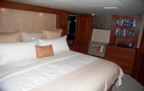 Motor yacht ESSENCE has a Main Salon with light and airy décor with rich American Cherry Wood. The Salon features a large sofa with coffee table and 3 occasional chairs plus a large desk with chair.