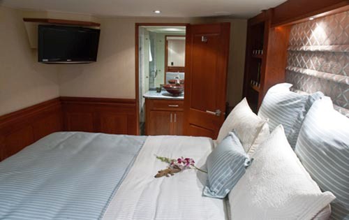 The Guest Staterooms located below deck aft each have a walk-around queen-size bed, en-suite head with shower, flat screen TV, DVD, AM/FM radio and IPOD docking station.