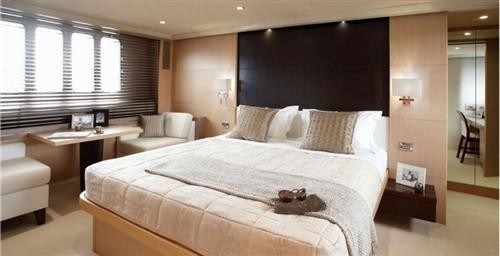 The dining table is located forward of the salon up a small step and offers great views while underway. The galley is situated to the port side and is equipped with the very latest appliances. A side deck access door allows Sabbatical III’s experienced crew of 2 to optimise service without disturbing guests onboard.