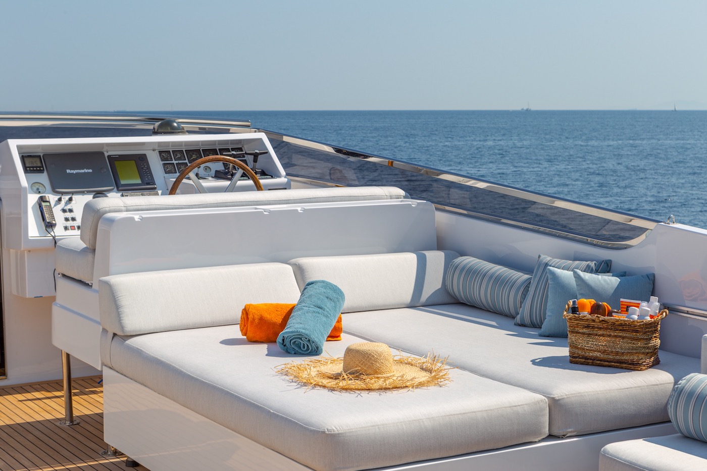 The flybridge also offers great views and further lounging and al fresco dining possibilities where she has two extendable tables an sun pads as well as a bar and storage for the tender.