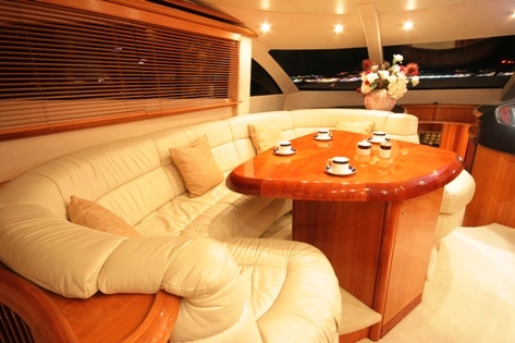 Further forward is the interior dining area to port with a couch and table. Opposite is the well equipped Galley. Guests can choose to dine inside, on the aft deck, or on the incredibly spacious fly bridge which has a barbecue, fridge and ice maker.