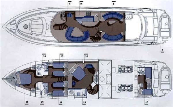 Luxury Sunseeker Manhattan 74 VOGUE OF MONACO can accommodate 8 guests in 4 cabins including a Master Cabin with king size bed and ensuite bathroom with its own separate staircase access amidships.