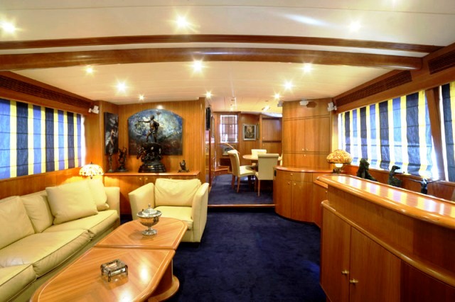 She has a classically designed main salon featuring warm wood paneling and large windows.