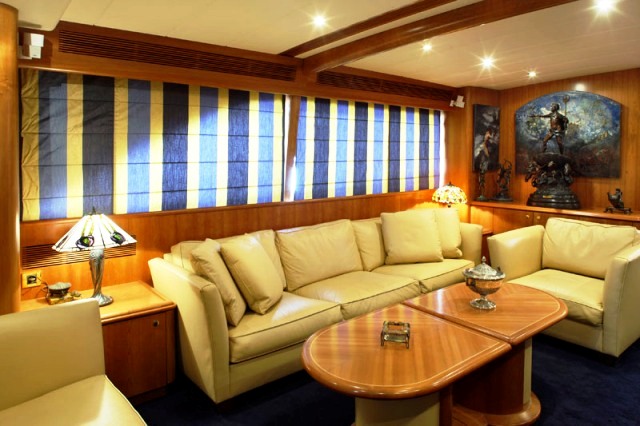 She has a classically designed main salon featuring warm wood paneling and large windows.