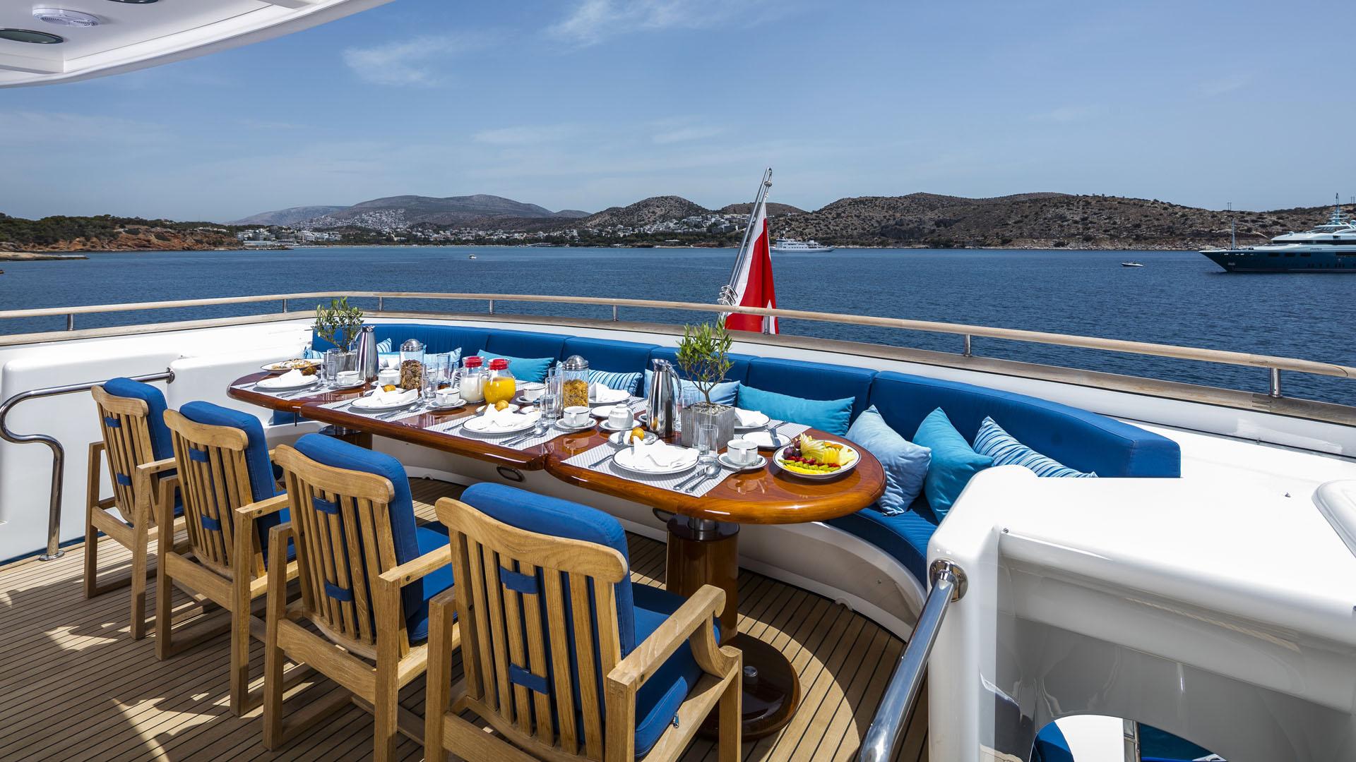 The Master suite boasts plenty of space, great views and a private deck! The upper deck features a half moon sofa couch with two tables and two cushion director arm chairs. From the Upper Deck, there are staircases leading to the Sun Deck.