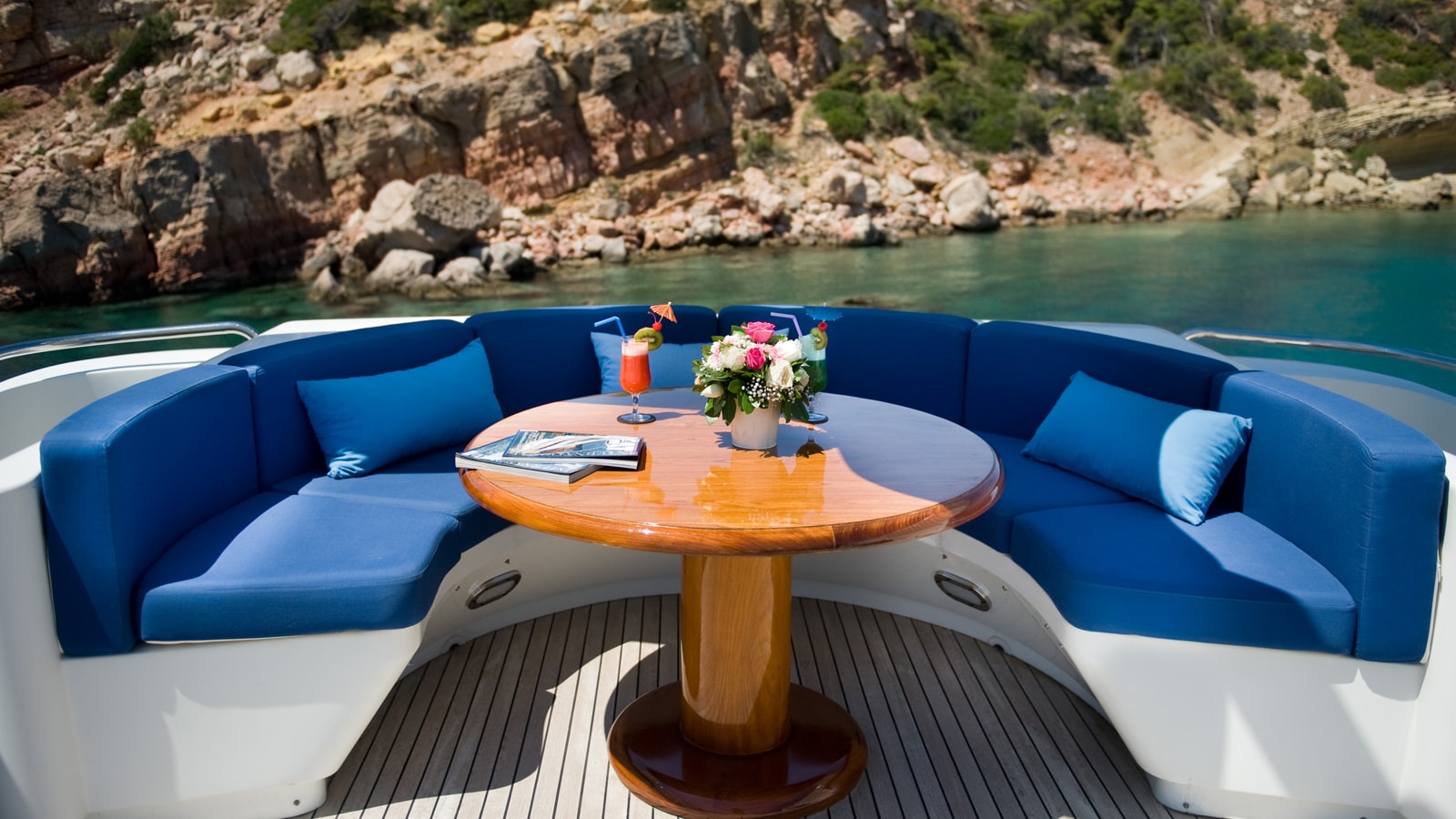 The exterior living spaces are voluminous. The Sun Deck/Fly Bridge boasts panoramic views with two very large sunbathing beds and a half moon sofa couch with coffee table.