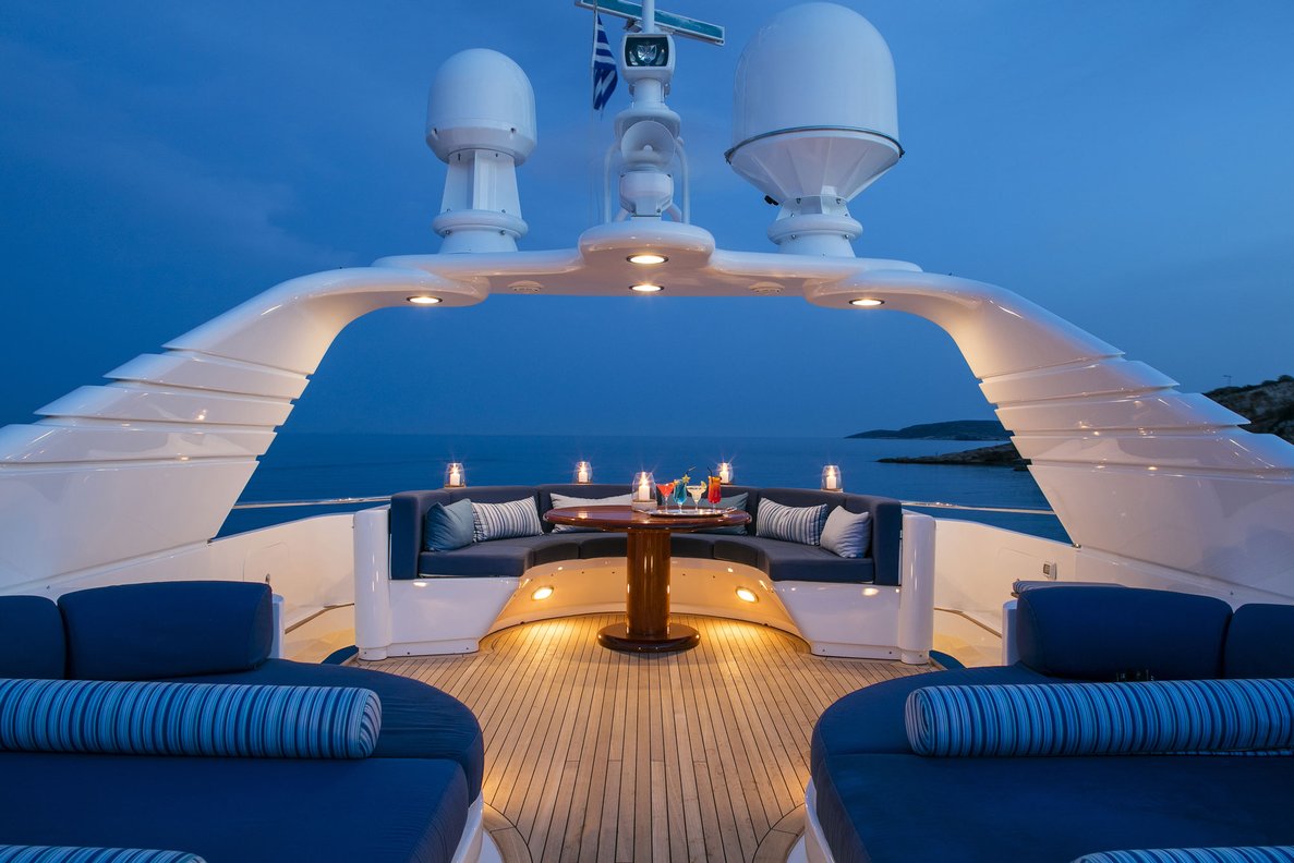 The exterior living spaces are voluminous. The Sun Deck/Fly Bridge boasts panoramic views with two very large sunbathing beds and a half moon sofa couch with coffee table.