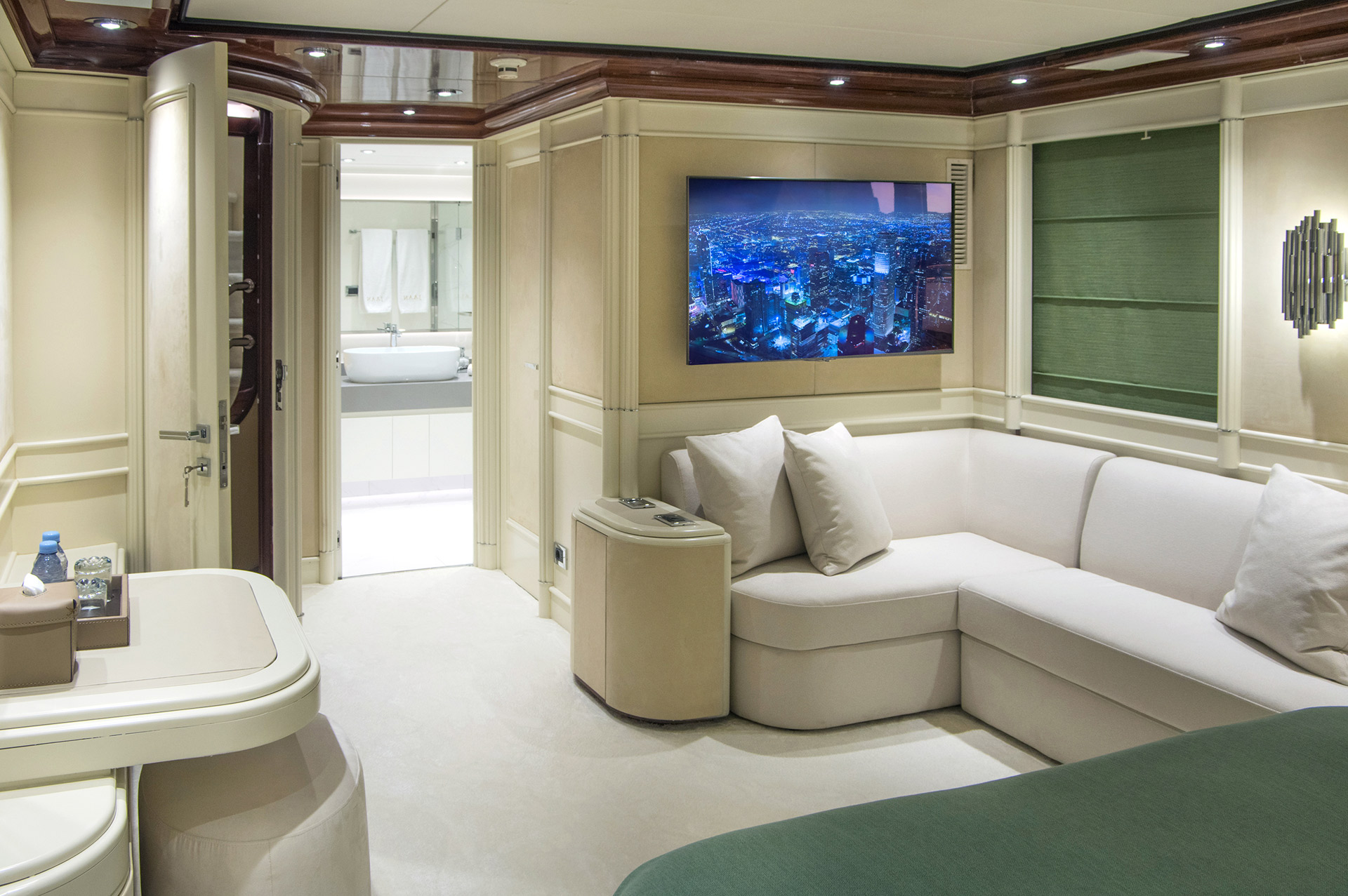 Motor Yacht JAAN has a large main salon with soft cream sofas with twin marble topped low coffee tables on rosewood bases.