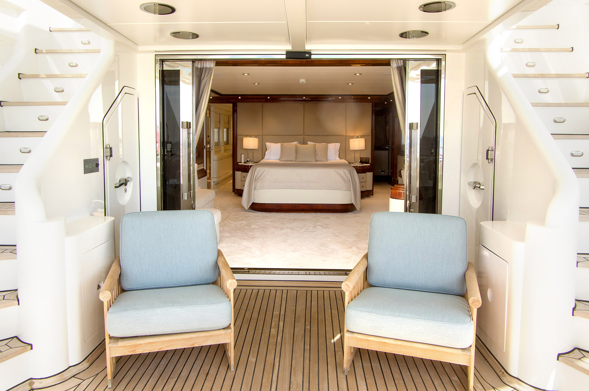 The Master suite boasts plenty of space, great views and a private deck! The upper deck features a half moon sofa couch with two tables and two cushion director arm chairs. From the Upper Deck, there are staircases leading to the Sun Deck.