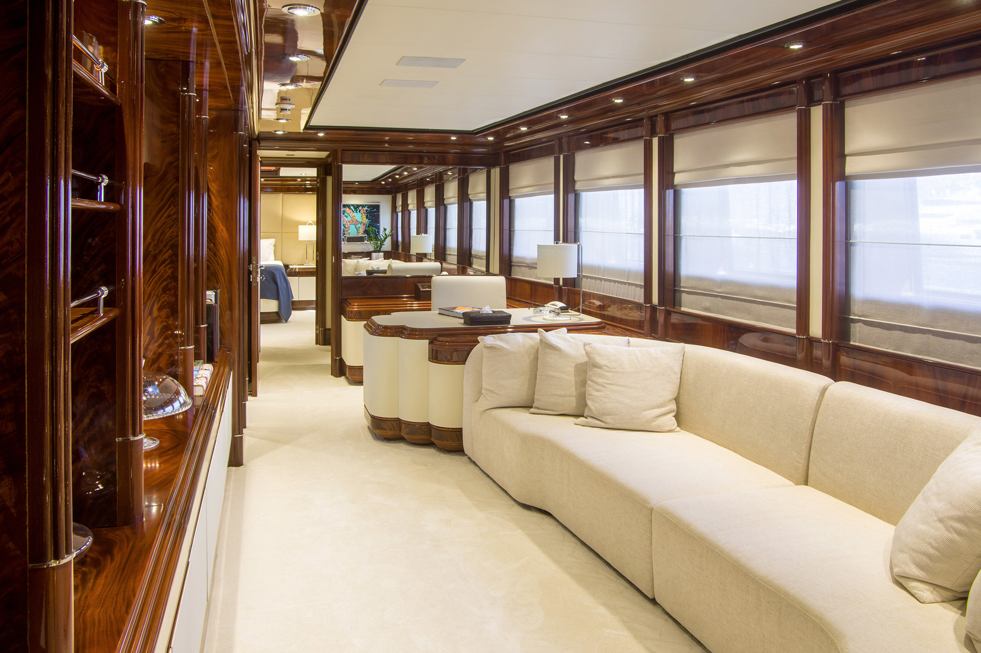Motor Yacht JAAN has a large main salon with soft cream sofas with twin marble topped low coffee tables on rosewood bases.