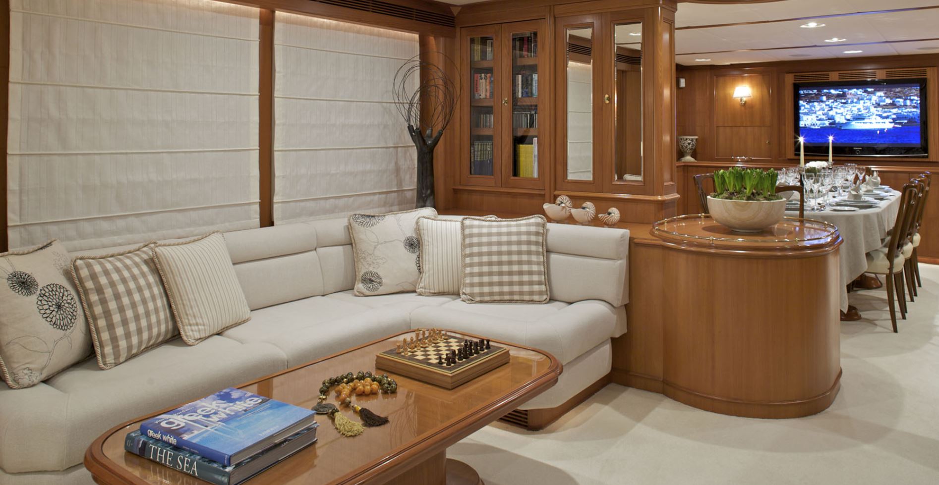 Both the salon and dining areas are spacious and feature panelled walls and an “Alcadara” leather ceiling. The dining table comfortably seats eight guests and against the wall is a large flat screen TV with two small lights for your viewing pleasure.
