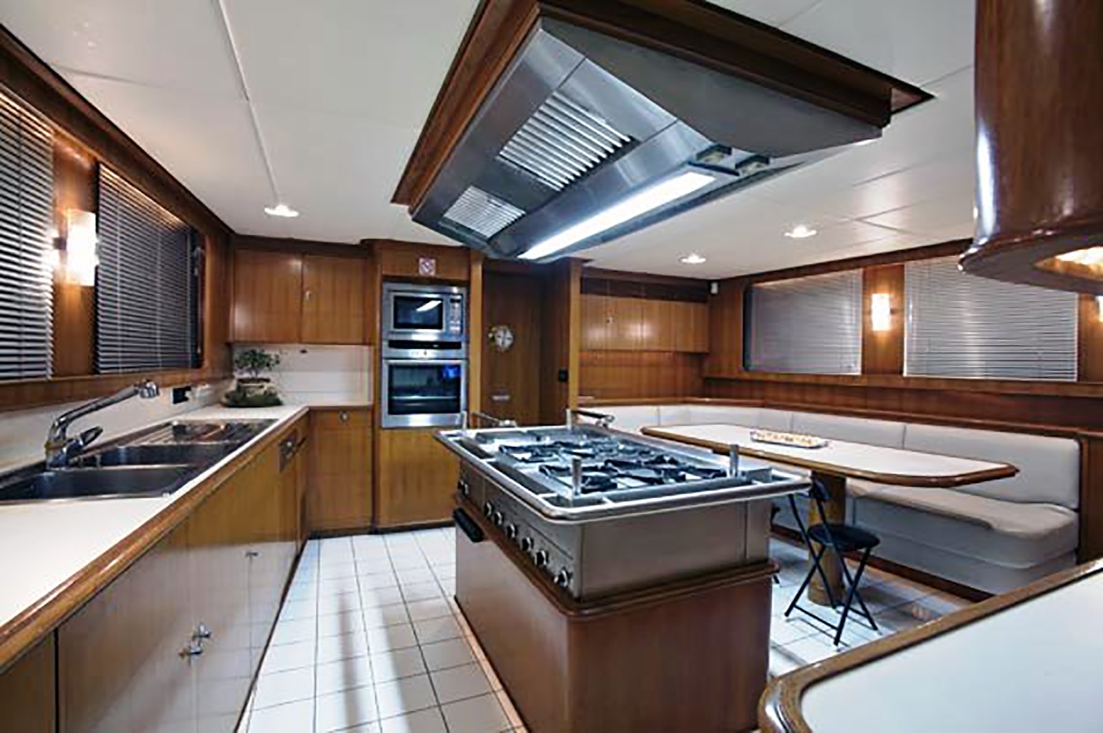 The galley is located forward of the dining room access on the starboard side and is fully equipped. The staircase to the upper level that leads to the sky lounge is the salon and dining room. The sky lounge is the ideal spot for quiet relaxation and features of a sofa and small coffee table, facing the flat screen TV.