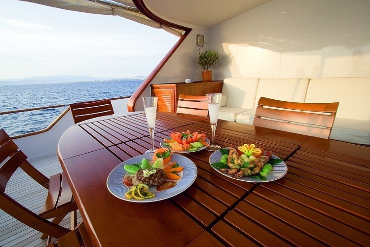 The classic motor yacht SYLVIANA boasts spacious outdoor areas including a sheltered area for alfresco dining on the upper deck, a lounging arrangement on the aft deck and cushions for sunbathing on the foredeck.