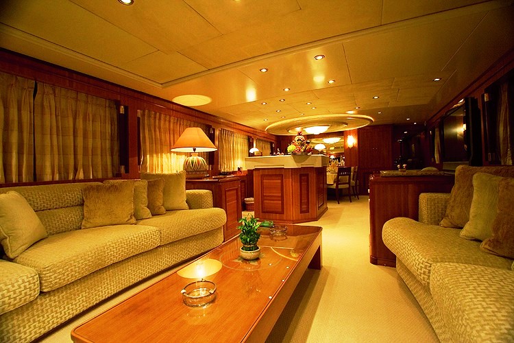 The beautiful CRN Ancona motor yacht SYLVIANA (ex Ragazza) has an elegant salon featuring a relaxed seating area with opposing couches, a central coffee table and an entertainment centre, and a freestanding bar.