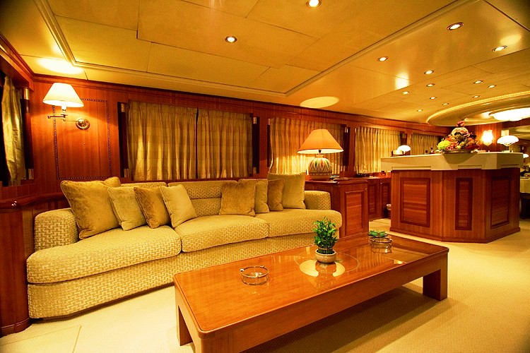 The beautiful CRN Ancona motor yacht SYLVIANA (ex Ragazza) has an elegant salon featuring a relaxed seating area with opposing couches, a central coffee table and an entertainment centre, and a freestanding bar.