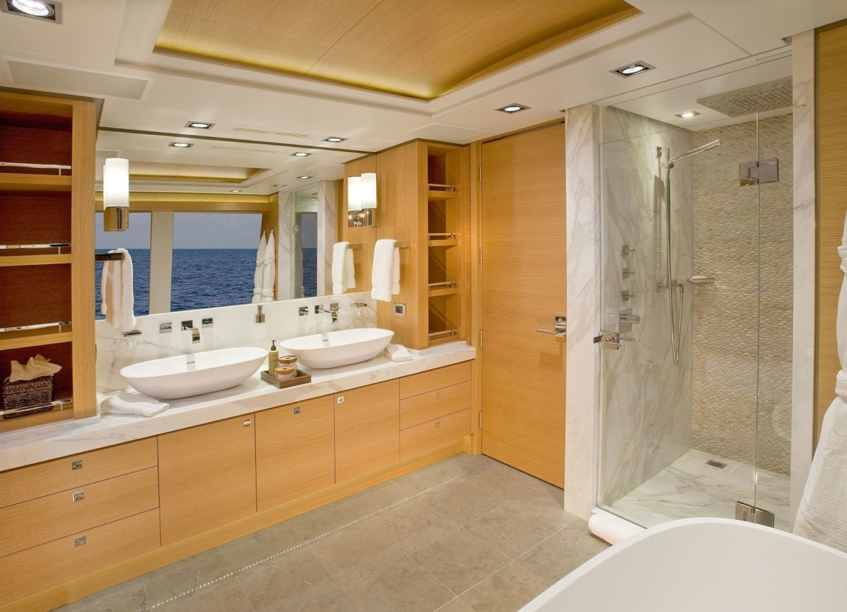 The guest cabins on the Main deck can be converted into two VIP suites. Wall disappears and beds fold back against the wall, giving flexibility. WATERSPORTS: