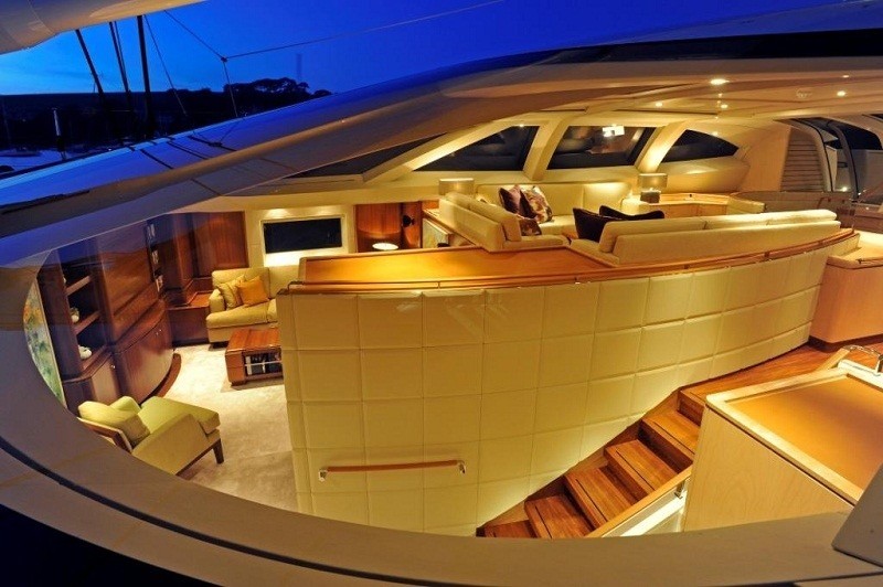 The upper lounge features 360-degree panoramic views with comfortable U shaped seating to starboard and a writing desk and stairs leading to the lower salon to port. The Lower salon has more room with an entertainment system to starboard and an extendable dining table to port.