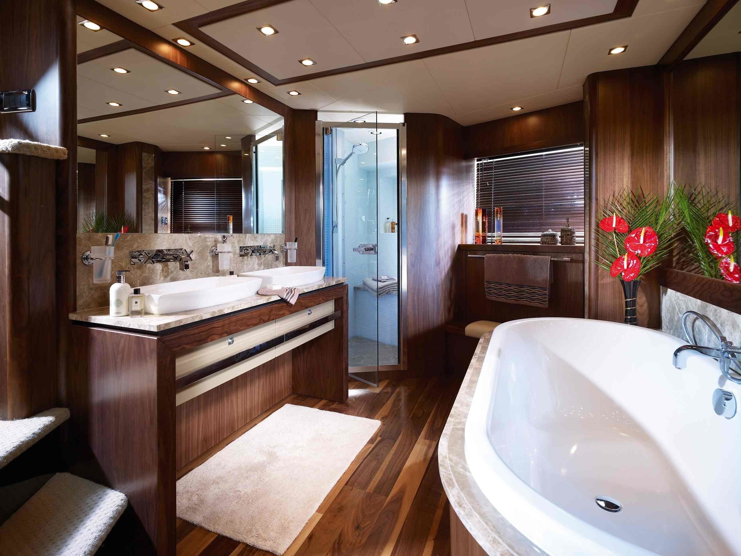 Motor yacht JIVA has generous interiors and accommodation for up to 10 guests in five luxurious cabins. Her stylish master cabin is located on the main deck and features a walk-in wardrobe and ensuite facilities. There are four guest cabins on the lower deck consisting of 2 Double guest staterooms and 2 Twin guest cabins.