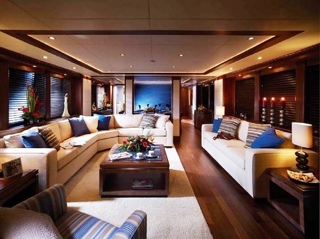The yachts main salon features large windows to port and starboard along with beautiful wooden floors and plenty of seating on an L shaped couch to port and another smaller couch to starboard. The dining room is able to seat 10 guests for sumptuous cuisine served up by the talented chef.