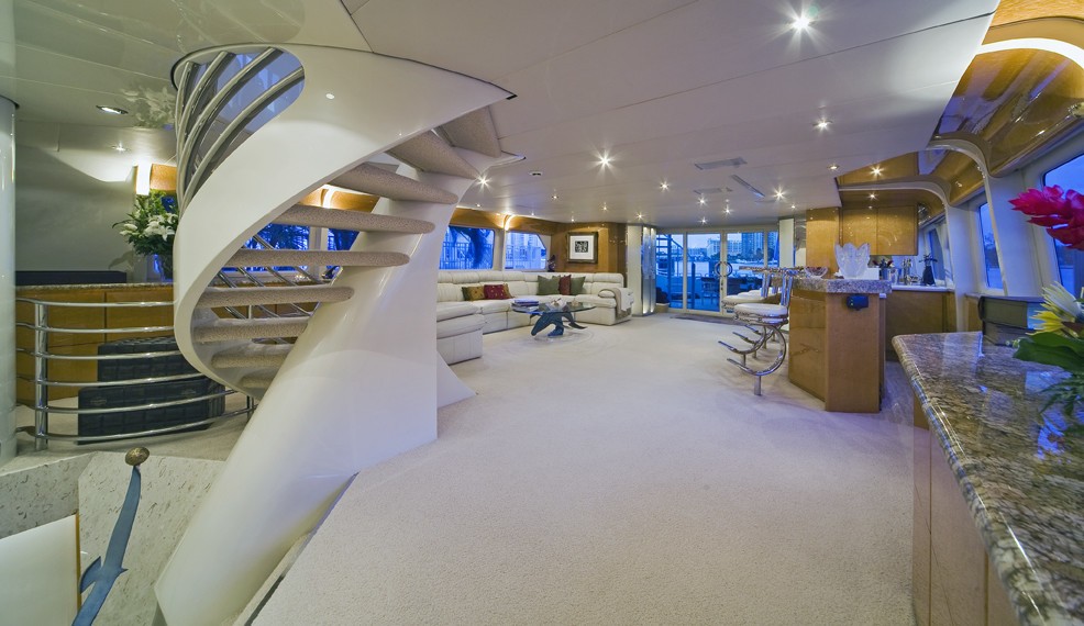 The yacht has a neutral palette throughout, providing a contemporary ambiance.