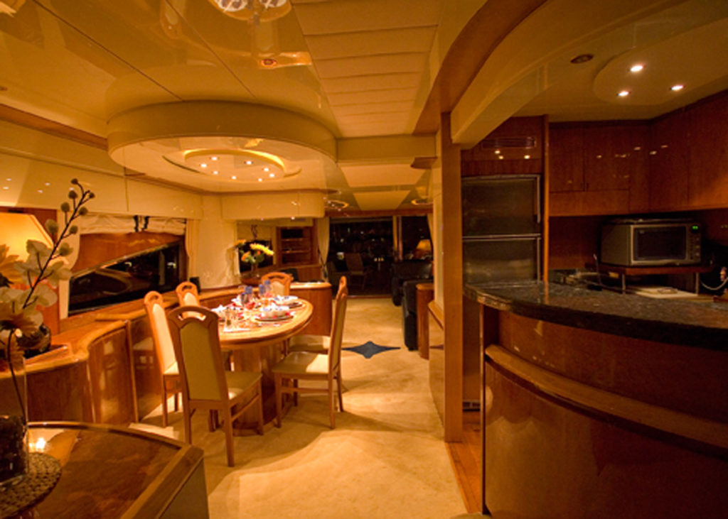 NOTABLE FEATURES for WHITE FANG: Contemporary interiors ~ Full beam master stateroom ~ Open plan salon and dining ~ Alfresco dining ~ Deck jacuzzi ~ Water toys ~ Wifi