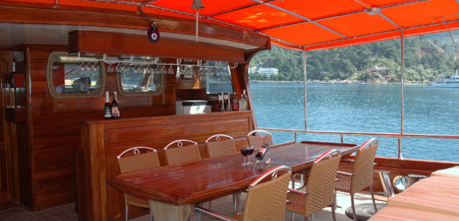 QUASART has an aft deck featuring a beautiful, fully stocked wet bar and a large dining table. The aft deck is the perfect spot for relaxing and enjoying a cocktail or al fresco meals. The fore deck provides lots of space to relax and enjoy the wonderful sunshine.
