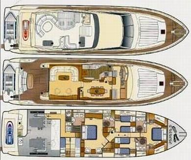 The Ferretti Motor yacht DUST has an elegant salon furnished with white leather U shape sofa and a dining area forward. Motor yacht DUST can accommodate 8 guests in 4 cabins on the lower deck.