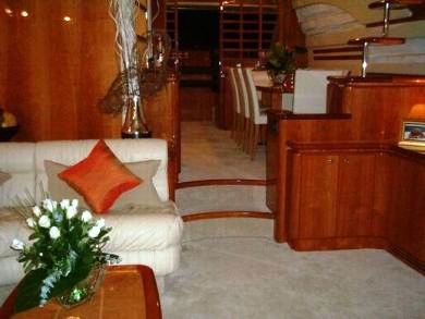 The Ferretti Motor yacht DUST has an elegant salon furnished with white leather U shape sofa and a dining area forward. Motor yacht DUST can accommodate 8 guests in 4 cabins on the lower deck.
