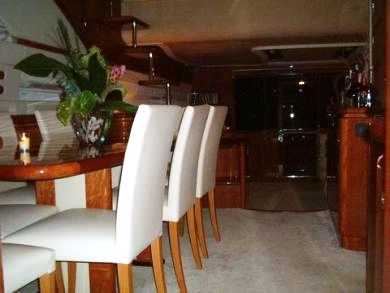 The Ferretti Motor yacht DUST has an elegant salon furnished with white leather U shape sofa and a dining area forward. Motor yacht DUST can accommodate 8 guests in 4 cabins on the lower deck.