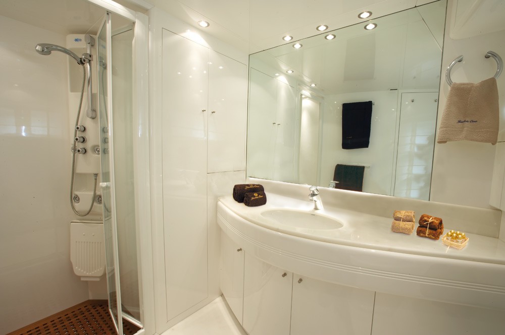 Charter yacht JACKIE ONE offers a sumptuous and elegant interior. Her wide salon features a large settee with Home Theatre plasma TV, and large windows that provide natural light and exalt the refined furnishing.