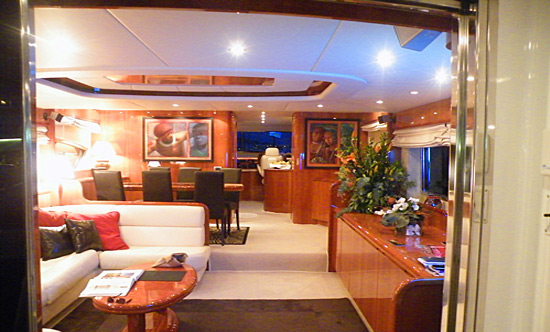 Her wide salon features a large settee with Home Theatre plasma TV, and large windows that provide natural light and exalt the refined furnishing. Guests are able to choose to dine from 4 separate areas including the elegant inside dining area, the spacious cockpit, the forward area and the top deck.