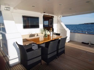 Motor yacht NOON TEASE also features huge sunbathing pads forward on both the fly bridge and the main deck. The spacious aft deck offers another al fresco dining area which is always a favourite for an early morning breakfast.