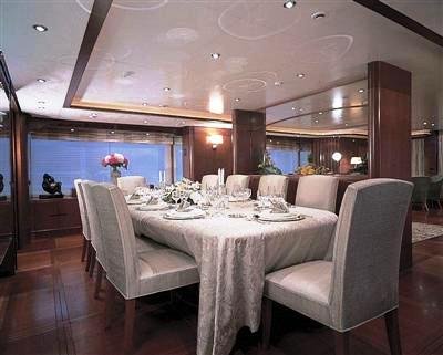 A rotating plasma screen TV separates M/Y MORE’s main salon from the dining room which can be used for entertainment in the salon and for conferences from the dining table.