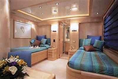 Luxury motor yacht MORE can accommodate up to 10 guests overnight in 5 cabins. The owner’s suite is accessed through the study, located on the main deck. The cabin is full width of the beam and features two bathrooms, one with Spa Pool, located below the window, and the other one with a large marble shower.