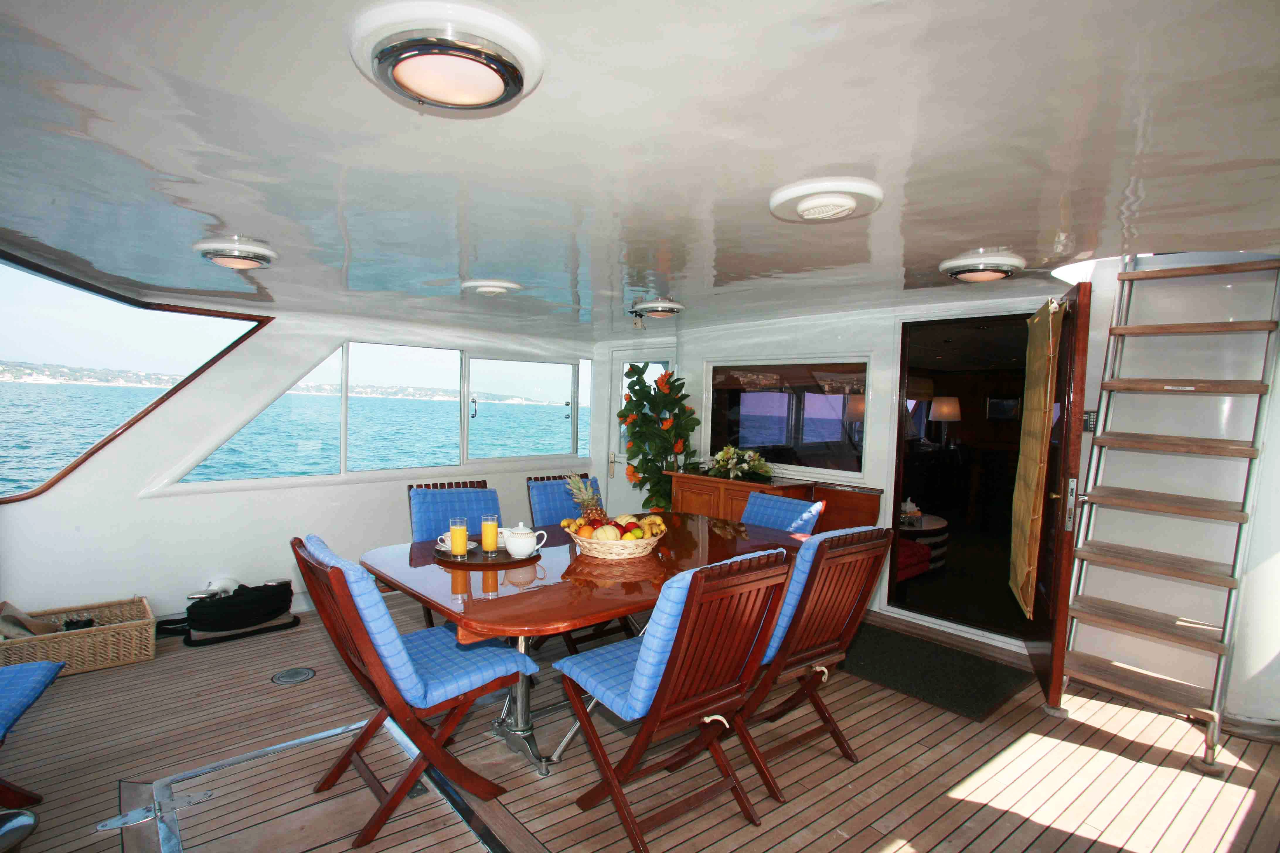 The yachts sundeck offers a wide deck , ideal for sunbathing, lounging or events. There is an additional sunbathing area forward as well as a spacious aft deck with a table for al fresco dining. A large swim-platform aft facilitates easy access to water sports and swimming.