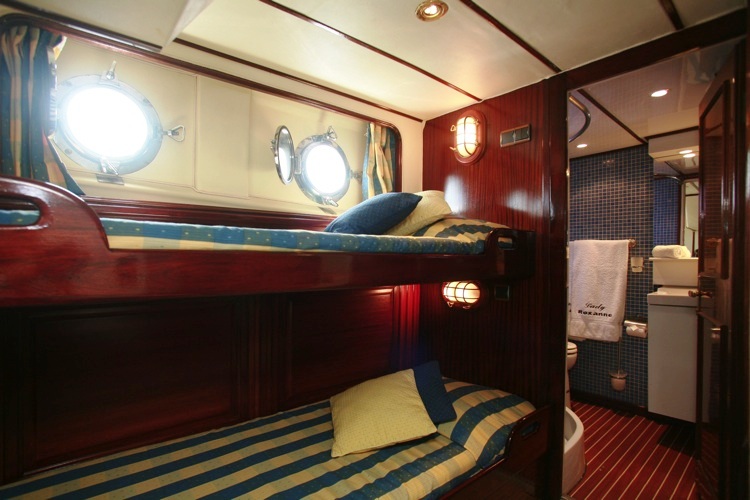 Luxury motor yacht LADY ROXANNE can accommodate up to 10 guests in 5 air-conditioned cabins. Her master cabin is located on the upper deck and features a king size bed. She has 3 twin cabins that are convertible to a double bed configuration and a twin bunk bedded bed cabin.