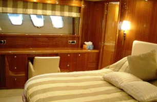 Her Master Cabin is located aft with a double bed, flat screen TV, DVD/CD surround sound system, walk-in wardrobe and en suite shower. The Forward VIP Cabin also has a double bed plus a flat screen TV, DVD/CD - two speakers with en suite shower.