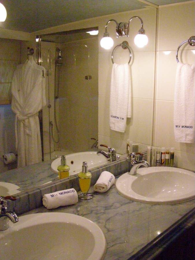 The cabin configuration consists of a full beam Master cabin on the main deck, and a VIP, a double and 2 twin cabins all with en-suite facilities on the lower deck. All bathrooms onboard M/Y MONACO has a hydro massage shower.