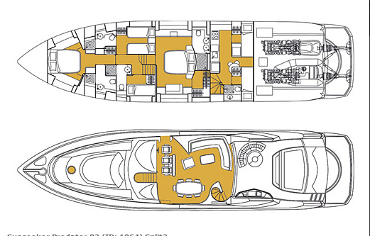 The master cabin is a full beam layout amidships, offering a king size center lined bed and walk in wardrobe. Forward and full beam of the yacht is a VIP cabin, with center lined queen size bed. One guest cabin features side by side twin beds, while the other has upper and lower single bunks.